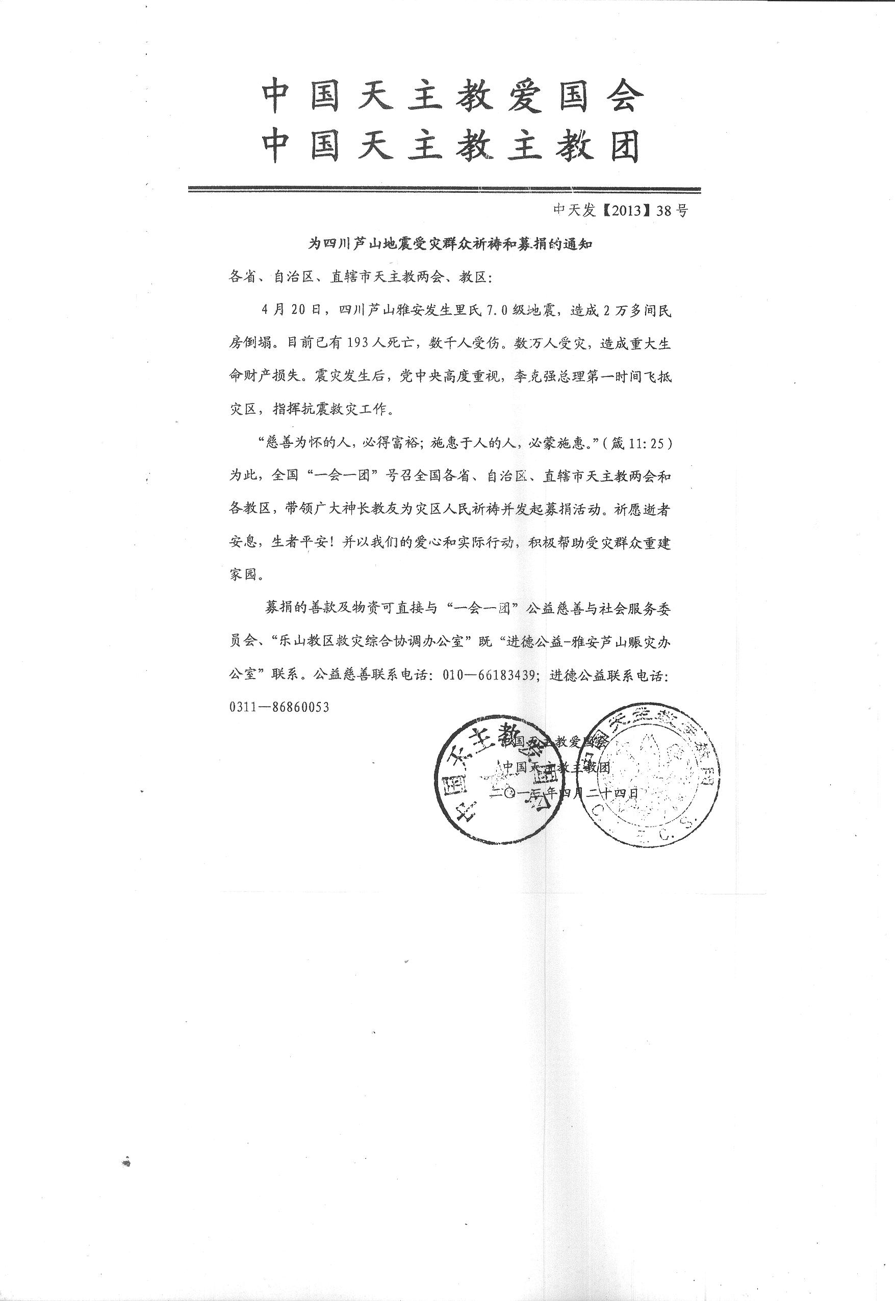 为四川芦山地震受灾群众祈祷和募捐的通知